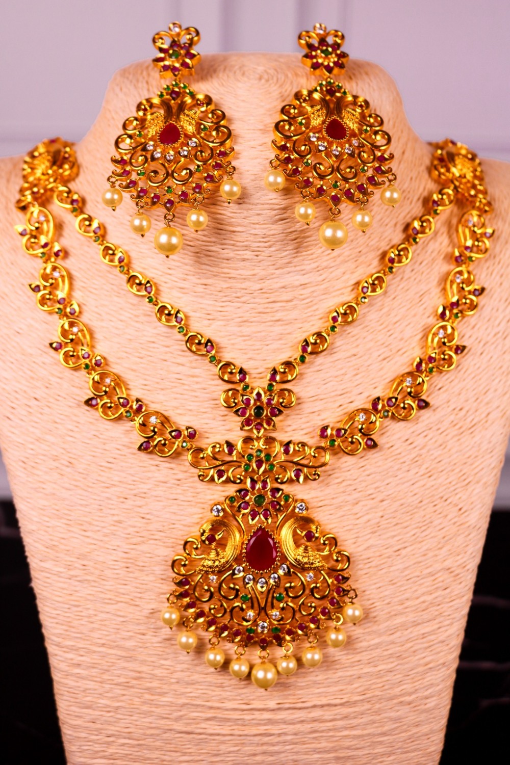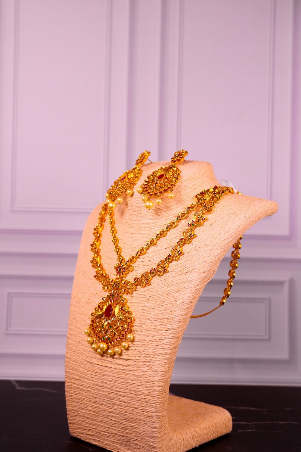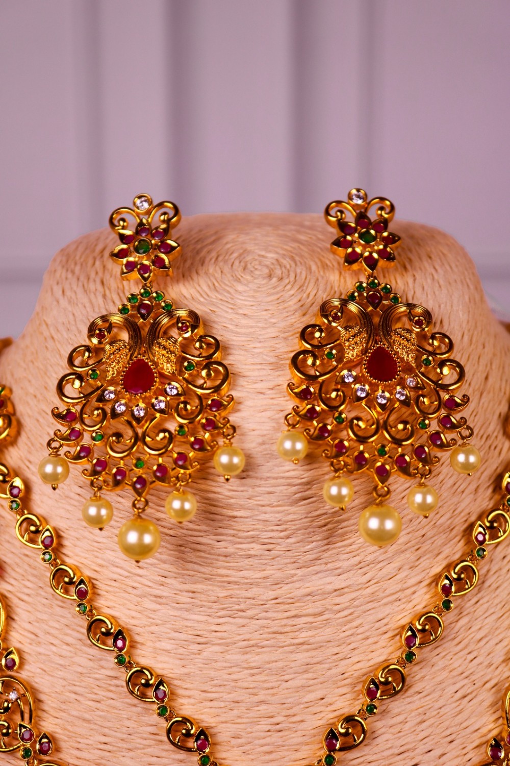 Gold Necklace and Earring set with Ruby and Pearl accents
