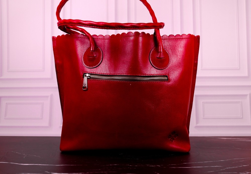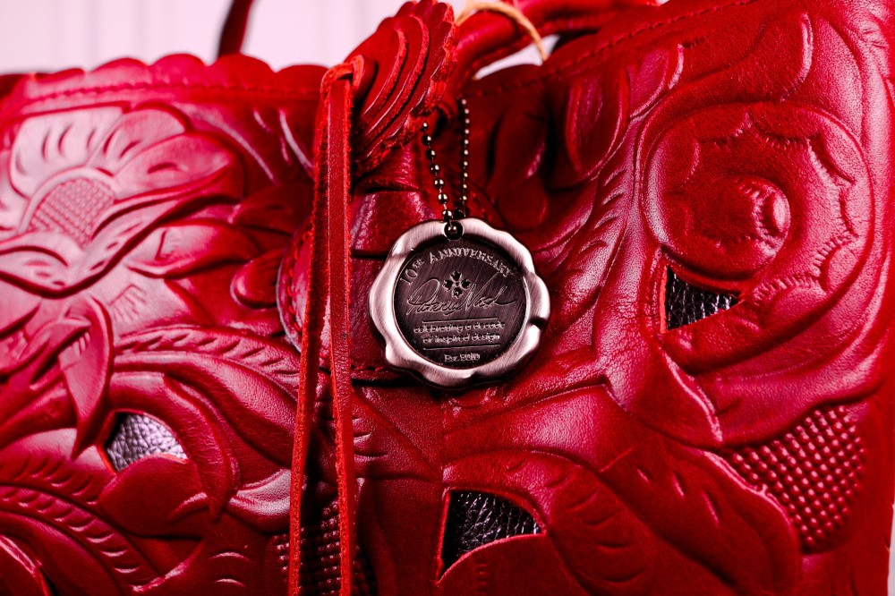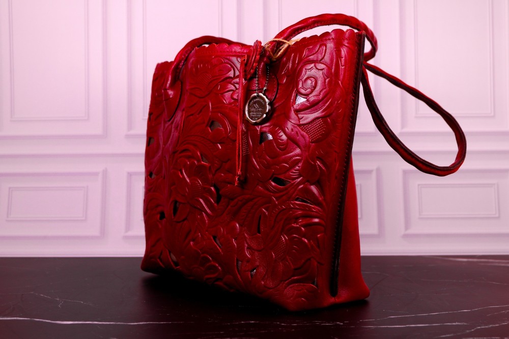 Magnetic snap closure, cutout leather tooling detail on front, smooth leather on back, twisted rope leather handles with tassel, adjustable/detachable strap, back zip pocket, metal feet